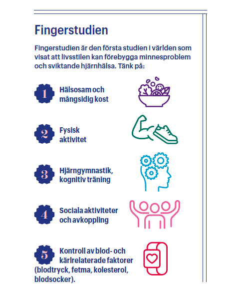 – Den senaste sammantagna forskningen visar att ungefär 45 procent av alla fall av demens har koppling till livsstils- och miljöfaktorer som går att påverka. Genom att åtgärda flera av dessa faktorer samtidigt kan man minska risken att drabbas. Många svenska kommuner satsar nu på förebyggande insatser för sina äldre. Hög ålder och genetik är de främsta riskfaktorerna, och eftersom vi lever allt längre är det också fler som drabbas av demens, säger Miia Kivipelto. Hon har tillsammans med sina kollegor i Sverige och Finland genomfört Fingerstudien, som fått stor uppmärksamhet i hela världen och hon har också skrivit boken Hjärnhälsa på dina fem fingrar. I sin forskning har hon tydligt kunnat visa fem faktorer som kan förebygga minnesproblem på äldre dagar.