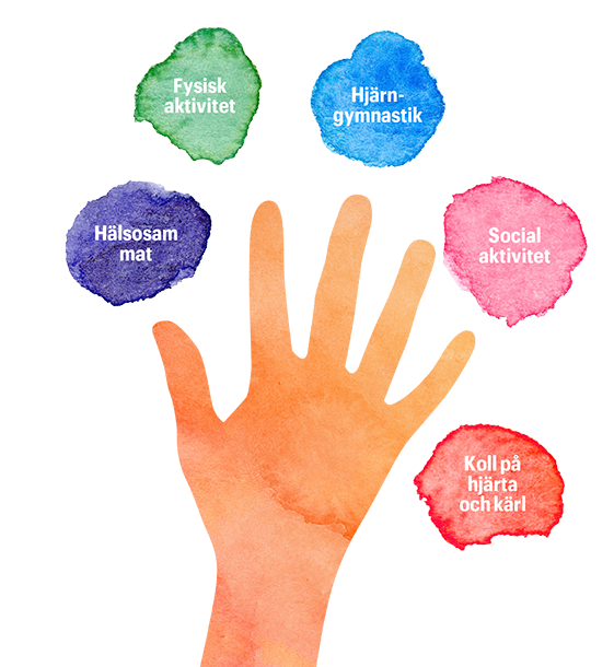 FINGER-modellen är den enda studie i världen som visar att livsstilen kan förebygga minnesproblem och förbättra hjärnhälsan. Genom att aktivera alla fem fingrarna, det vill säga införa flera livsstilsförändringar samtidigt, kan det få tydlig effekt för hjärnan, minnesproblem och generell hälsa.