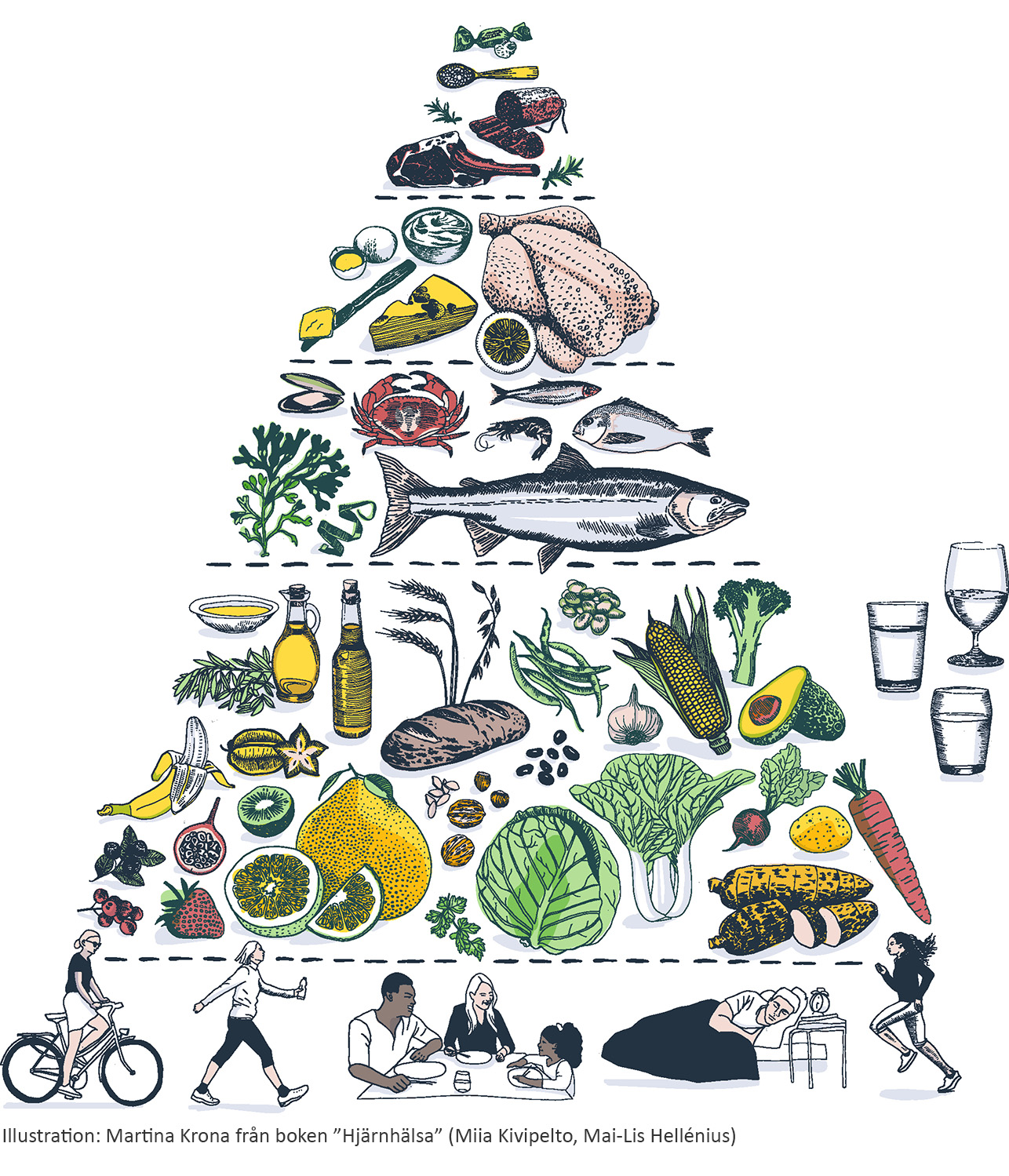 Rörelsepyramiden visar vilka aktivitetsnivåer som rekommenderas för att ge skyddande effekter för hjärtat, blodkärl och hjärnan. I pyramidens bas hittar vi dagliga aktiviteter som exempelvis promenader, cykling, städning, trädgårdsarbete, lek med barnen och att gå i trappor. Undvik att sitta alltför långa stunder i taget. Pyramidens andra nivå visar att vi behöver träna mer intensivt 150-300 minuter per vecka. Alla muskelgrupper bör aktiveras och träningen bör spridas ut under veckan. Pyramidens topp påminner oss om att även lägga in styrketräning 2-3 gånger i veckan.