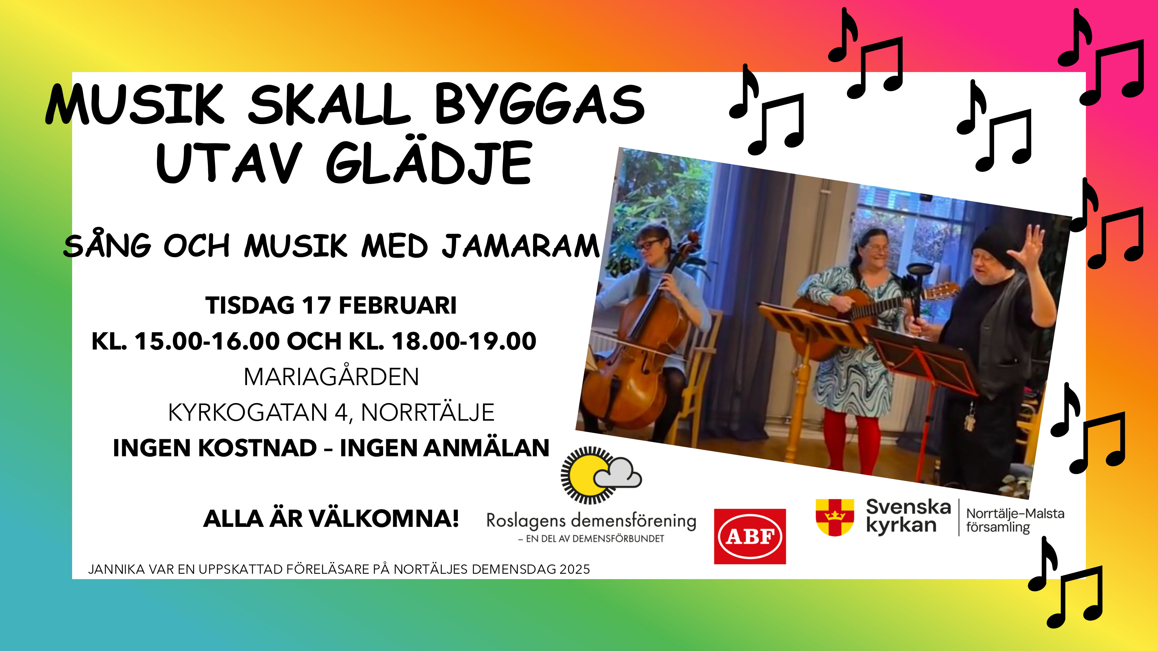 Kom och fyll på dina endorfiner med sång och musik – Jannika Häggström med gruppen JaMaRam spelar och sjunger. Jannika hade en mycket uppskattad föreläsning på Norrtäljes Demensdag 2025 om musikens betydelse.