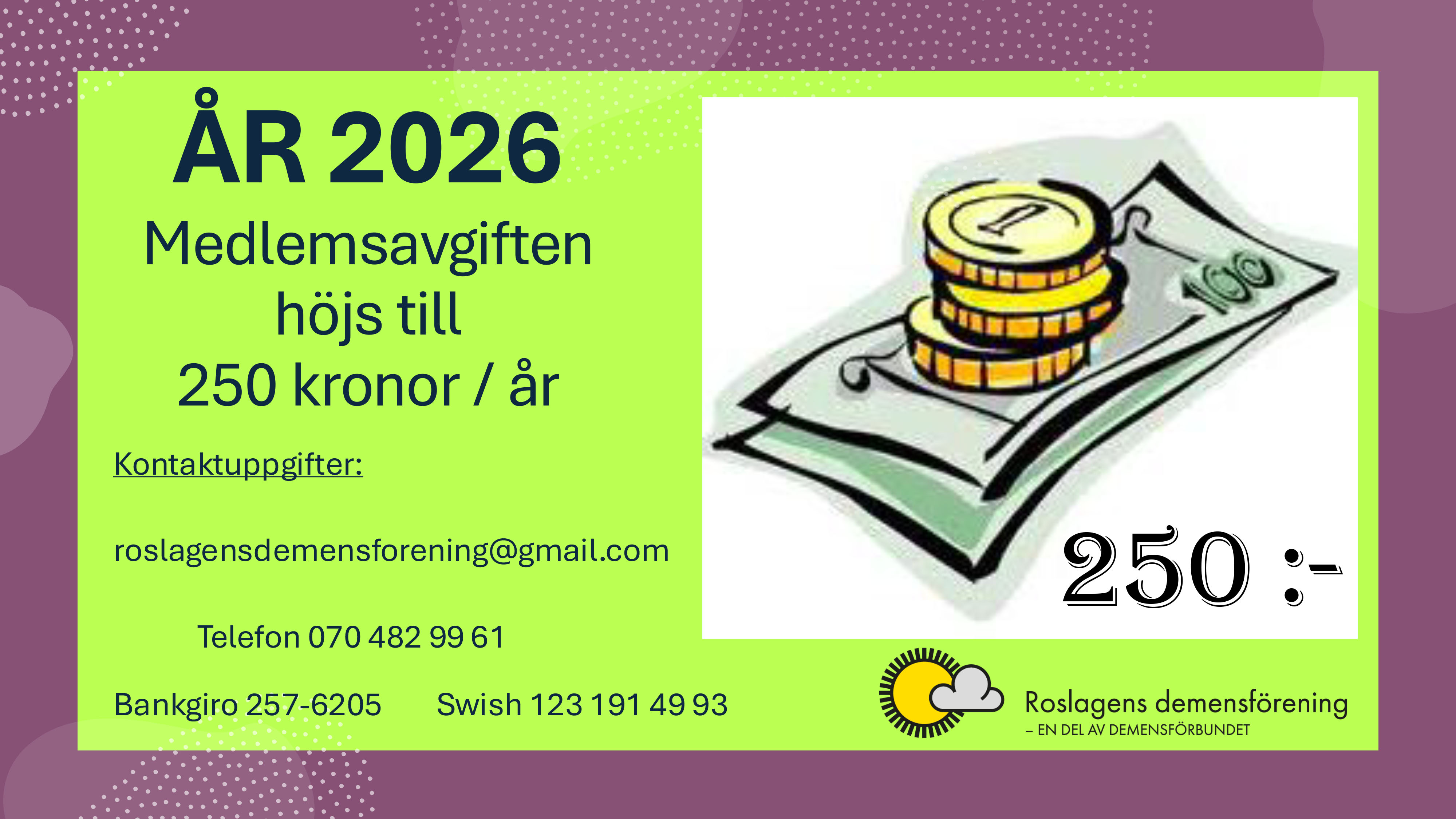 Betala då in medlemsavgiften, som är 250 kr per familj, till Roslagens Demensförening på bankgiro 257–6205. Ange namn, adress, mobilnummer och mejladress så skickar vi medlemsmaterial.