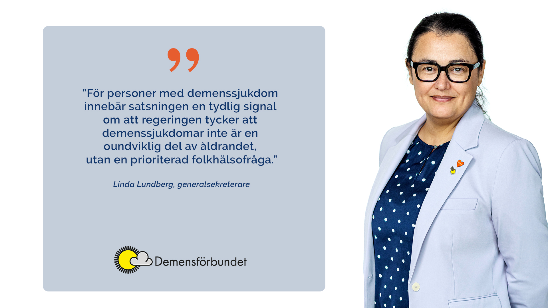 – Regeringens beslut att satsa drygt 58 miljoner kronor på att stärka demensvården och det förebyggande arbetet är ett viktigt och välkommet steg framåt. För personer med demenssjukdom innebär satsningen en tydlig signal om att regeringen tycker att demenssjukdomar inte är en oundviklig del av åldrandet, utan en prioriterad folkhälsofråga. Demensförbundet ser positivt på att hjärnhälsa och demenssjukdomar ges ökad prioritet. Vi välkomnar därför regeringens beslut och ser fram emot att satsningarna bidrar till en mer kunskapsbaserad, jämlik och personcentrerad demensvård i hela landet, säger Linda Lundberg, generalsekreterare på Demensförbundet.