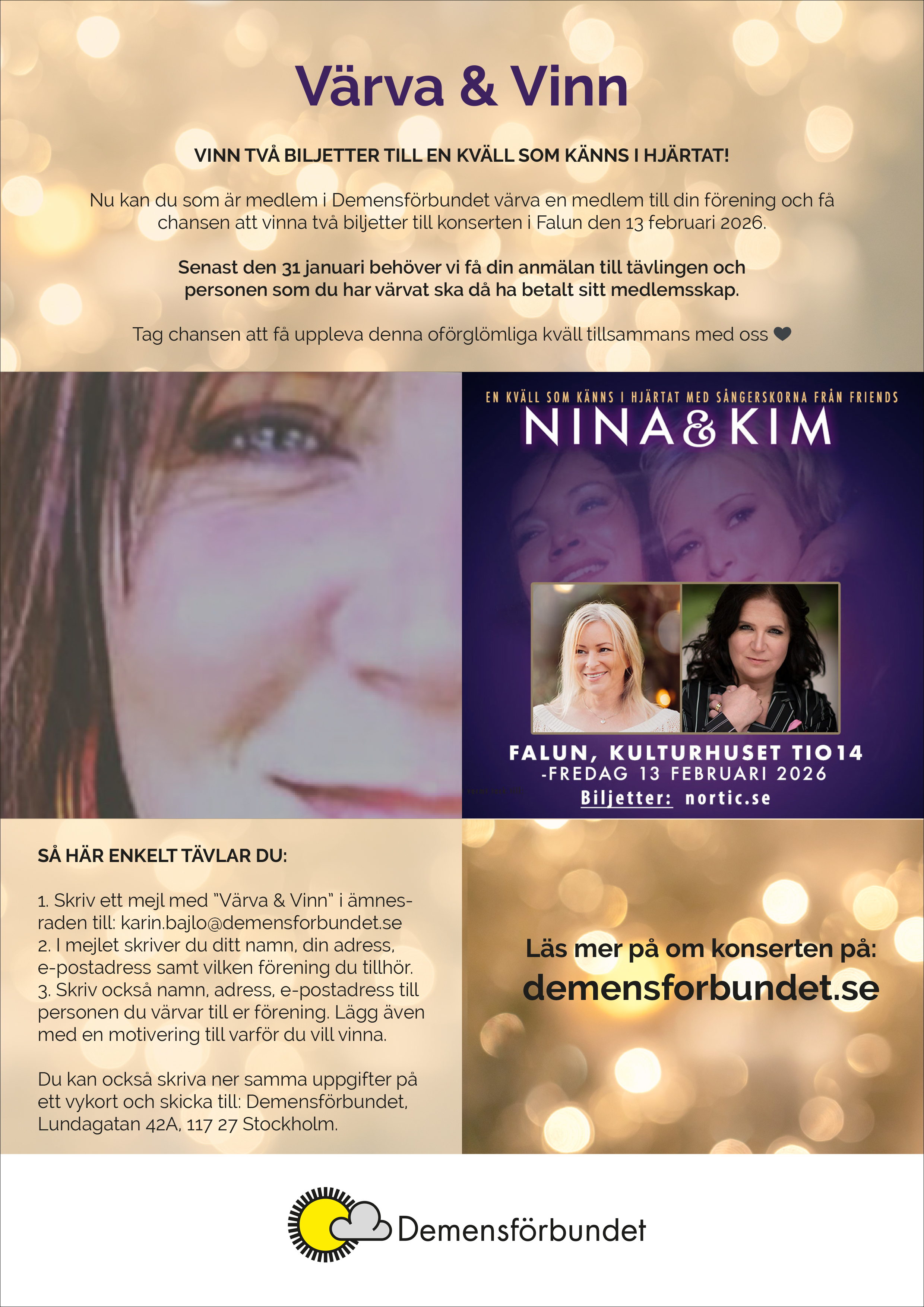 Värva en medlem till Demensföreningen Rättvik och få chansen att vinna två biljetter till konserten i Falun den 13 februari.