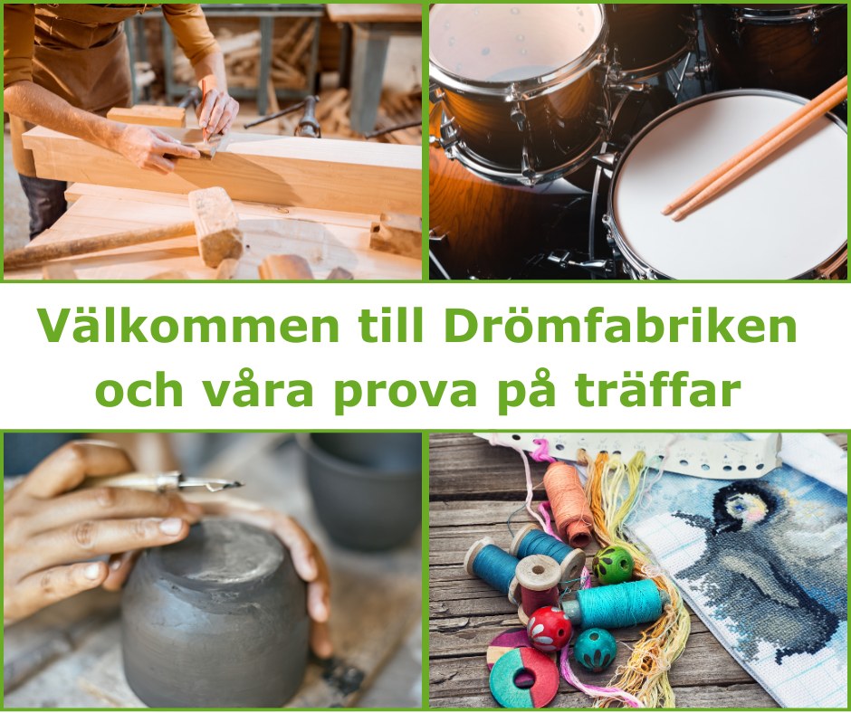 I vår får vi chansen att vara i Drömfabriken, ett kreativt hus fyllt av möjligheter! Här finns konstverkstad, syateljé, snickeri, keramik, sång & musik, fik och kunnig personal som inspirerar och hjälper till i skapandet. Under våren kommer två studiecirklar genomföras, du anmäler dig till en av dem.